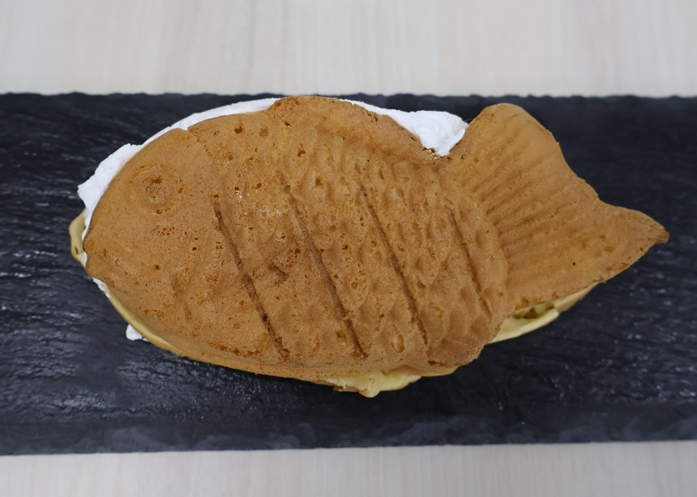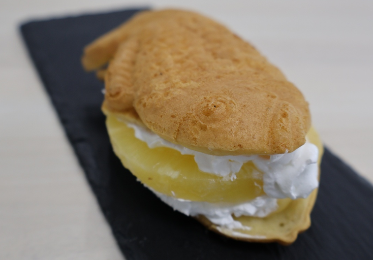 毎年冷やしたい焼きのフィリングが変わる中、今年は夏季限定の「パイン生クリーム」が登場。「パイン生クリーム」は、たい焼きの中に冷たい生クリームがたっぷりと詰め込まれ、その上に半月型のパインが乗っており、ボリューム満点で見た目も斬新だ。二代目店主の鈴木氏は味だけではなく、見た目にも変化をつけることで〝お菓子って楽しくて美味しい〟と思ってもらいたいと語っており、「パイン生クリーム」はその想いが具現化した一品だ。
