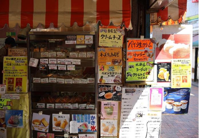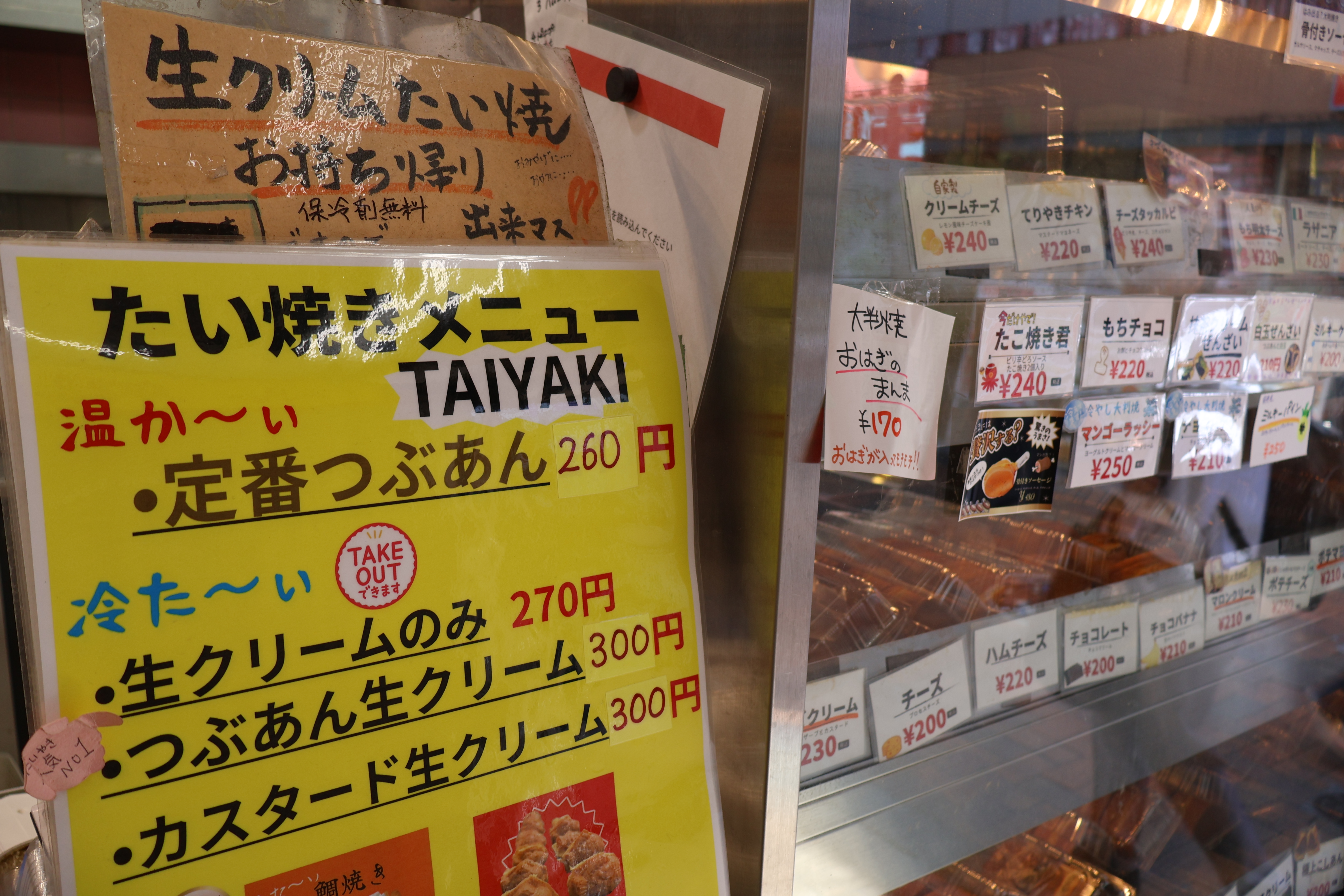 店頭ディスプレイには様々な種類の具を入れたたい焼き・大判焼きが所せましと並んでおり、多い時には40種類以上にもなるという。