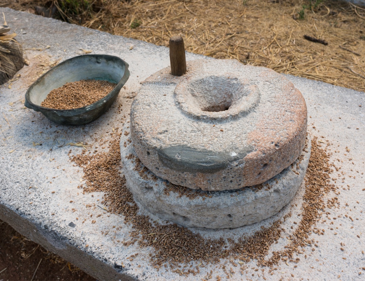 何千年もかけて挽き臼の改良を続け、ふたつの石の円盤の間に小麦をはさみ、上の石を回転させる「石臼」が現れました。